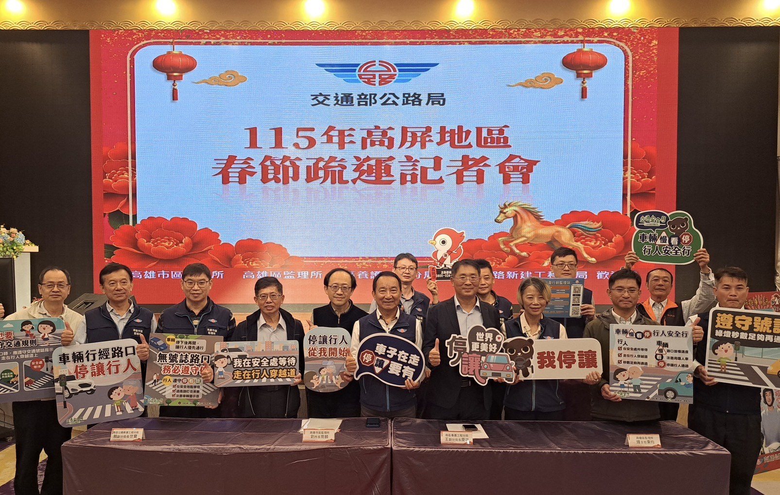 高雄市區監理所聯手高雄區監理所、南區養護工程分局、南區新建工程分局, 在高雄市舉辦115年度高屏地區春節疏運記者會。 向媒體說明春節期間的交通疏運措施與服務規劃,特別整理高屏地區熱門景點的易壅塞路段,提供交通管制與替代道路資訊,讓大家行程更順暢。