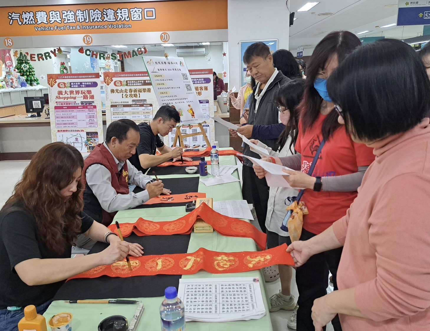 在 1 樓洽公大廳舉辦「2026駿馬奔春 福滿人間」揮毫贈春聯活動, 特別邀請書法名家楊老師千瑩與王老師于升, 現場揮毫書寫 為洽公民眾送上滿滿的新春祝福。